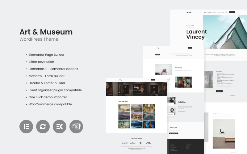 Artey 艺术博物馆主题是一个易于使用的 WordPress 主题,可加快您为博物馆、艺术画廊、商品商店、管理展览活动等网站创建的速度! 该主题已在预内容演示中准备就绪,只需使用一键安装功能即可获得所有演示页面的 Web 设置,这些页面与演示主题预览完全相同。 该主题非常适合那些想要灵活设置无限页面布局、创建自己的大型菜单、以自己的风格创建无限网页页眉和页脚的人,因为该主题有一个自定义插件,可以自由创建所有网页元素,并且无限制。