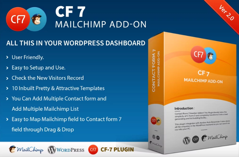 简介联系表格 7 Mailchimp 插件!这个插件确实采用了 C Form 7 的简单性,并且完全 将其转变为潜在客户生成和列表构建工具…。 该插件与 Mailchimp 自动回复器集成。它还将所有查询存储在 WordPress 后端,因此您可以通过 csv 将其保存到您的 PC 中。 特征 您可以添加多个自定义字段 通过拖放轻松将 Mailchimp 字段映射到联系人表单 7 字段 不必移动到 Mailchimp 帐户,只需查看新访客记录即可。 10 个内置漂亮且有吸引力的模板来创建您自己的订阅者表单,不浪费时间。 添加多个表单连接到多个列表的功能 一键检查您的 Mailchimp 帐户的所有广播活动。 列表管理器将向 Mailchimp 列表提供已订阅、未订阅和总访问者的总记录。 下载到您的 PC 硬盘中,并具有导出为 CSV 文件的功能。 表单的简码适用于帖子或页面,甚至侧边栏。 易于设置和使用。 方便使用的。 解释所有功能的演示视频。 与最新的 jQuery 和最新的 WordPress 兼容。 软件包中包含常见问题解答和源代码。以后免费更新。 完整的文档和 24*7 支持。 联系表 7 的存储和内置功能