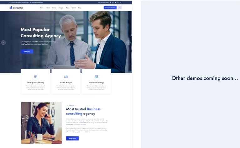 Consultar 是一个咨询 WordPress 主题。这是一个现代、美丽、优雅的咨询业务主题。您可以根据需要更改所有部分。有一个定制选项,每个部分都是咨询服务的独特创意。它具有独特的设计和令人惊叹的功能,适合想要建立网站的咨询企业。我们已经构建了咨询业务服务公司所需的所有咨询功能。那里的每个部分都具有独特的创意。它在移动设备和桌面上看起来很棒。干净简单