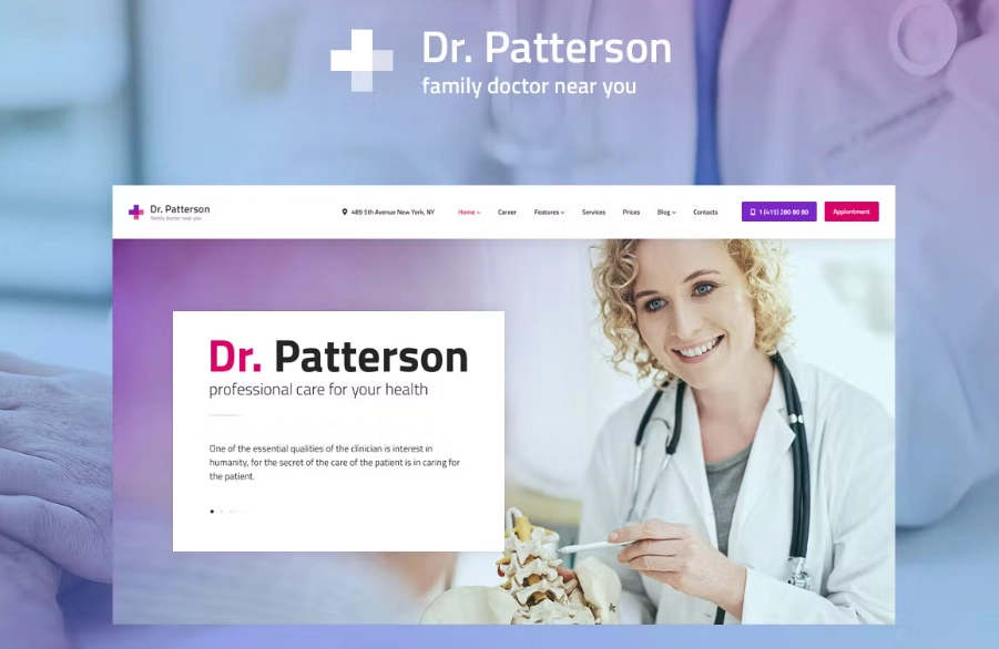 *Dr.Patterson 是一个终极美丽的通用医疗 WordPress 主题。它适合现代医院、诊所服务、诊所、救护车解决方案、护理机构、医疗机构、医疗设备商店、医疗临终关怀中心、疗养所、疗养院甚至疗养院业务领域的任何现代项目。 它还适合健康和美容行业,如皮肤科诊所、美容机构、护肤品商店、发型设计、指甲护理、整形外科、美容诊所、发型设计、美容诊所、激光手术、水疗中心、健康医院、按摩和美容护理,我们的新产品主题是您的完美选择。医学医疗保健 WordPress 主题很棒的功能 * 6 个预制主页 * 在线预约 * 预约管理 * 在线安排时间表 * 高级联系表格 * 预制模块:诊所医生单页、定价和服务 * 为医学医疗保健 WordPress 主题 Dr.Patterson 制作插件与 WPBakery 页面生成器兼容。它适合美容师、皮肤科医生、外科医生、光动力疗法、身体轮廓、冷冻疗法、皮肤手术、激光治疗、医疗修复嫩肤,并可以安排预约。 该主题是一个易于使用、现代、高度响应和 100% 视网膜就绪的 WordPress 设计,由于内置的帖子类型(服务、感言、团队成员等),它将以最有效的方式展示您的服务,与 Slider Revolution(如果安装为主页滑块,会立即引起注意)、WP Bakery Page Builder(用于构建更独特的页面布局)、Booked Appointments(用于安排与患者的会议)等流行插件的兼容性。