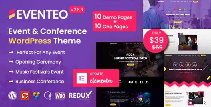 Eventeo 是一个创意、干净且独特的响应式 WordPress 主题,适用于任何类型的任何会议、活动、聚会、研讨会、展览、聚会、代表大会、会议、商务会议、活动管理网站。它配备了高品质的 06 Awesome Multipage、06 Onepage 主页和许多内置的很棒页面。