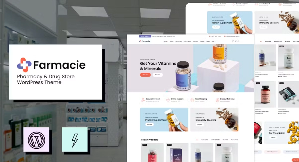 Farmacie Pharmacy 药店主题是一个设计精美且用户友好的 WordPress 主题,专为药房和药店创建。凭借其响应式布局、强大的功能和简单的自定义选项,该主题允许您以有吸引力和专业的方式展示您的产品和服务。无论您是当地小型药房还是大型连锁药店,Farmacie 都是为您的企业打造令人惊叹的在线形象的完美解决方案。