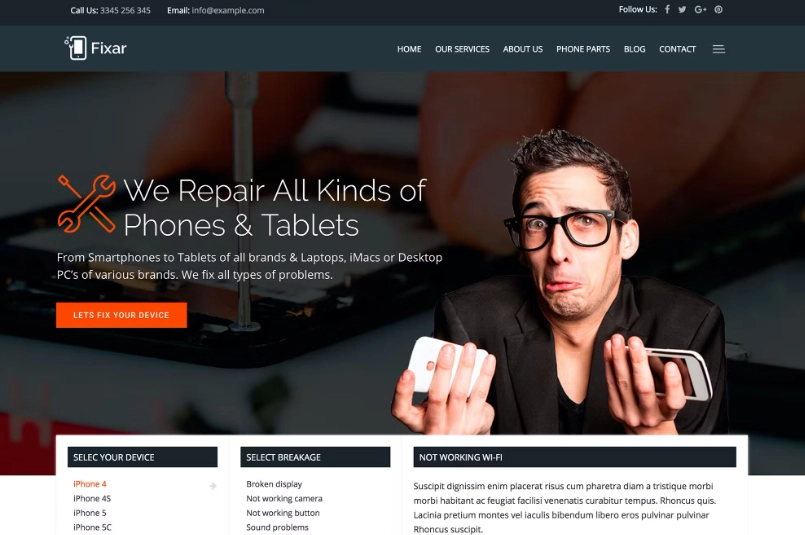 Fixar 手机维修和电脑维修 WordPress 主题致力于维修电子智能手机、笔记本电脑和电脑、游戏机和家用电器。主题易于更改且易于使用。