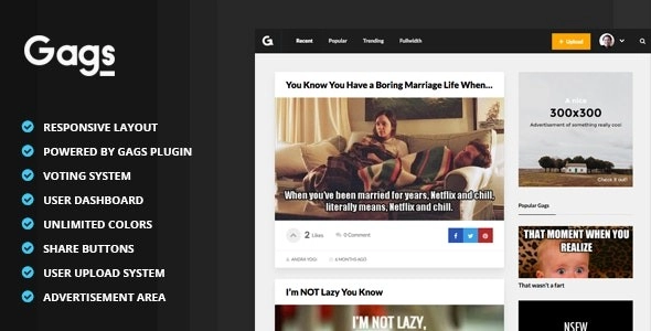 Gags,这是一个完美的 WordPress 主题,可使用 WordPress 创建搞笑、模因或其他图像共享网站(就像 9gag)。简而言之,您可以使用此 WordPress 主题创建您自己的搞笑或模因网站版本。 Gags 如此易于配置和使用,需要更改颜色和排版吗?别担心,我们已经为您提供了帮助,所有颜色和版式都可以从我们的主题选项中更改。 Gags 还由我们的自定义插件提供支持,该插件管理所有提交的媒体用户。哦,我们有告诉过您可以提交图像和视频吗?您还可以为每个提交的笑话添加描述。 为了防止垃圾邮件发送者注册,我们添加了 Google reCaptcha 的验证码功能。您还可以通过启用 Facebook 和 Twitter 登录来让用户更轻松地注册。 去吧,查看主题预览,看看该主题在我们的演示网站中如何工作。