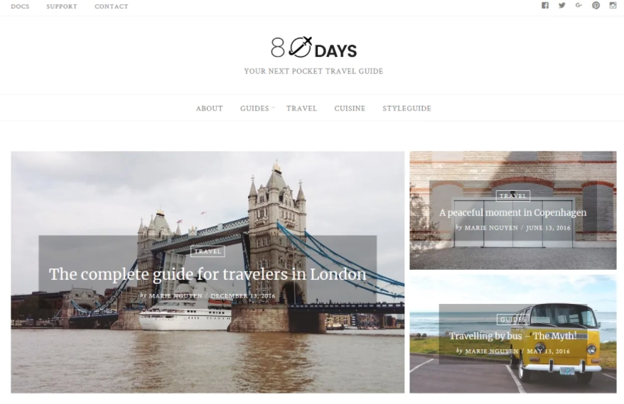 八十天是一个美丽的 WordPress 旅行主题,适用于旅行博客或杂志。 《EightyDays》拥有现代、干净、优雅的外观,并为博主提供大量定制功能。 《EightyDays》基于 WordPress 的最新技术构建,轻量级、快速且针对所有手机进行了优化