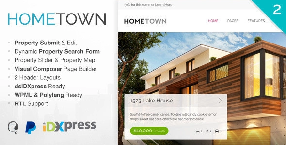 Hometown 是房地产相关网站的高级 WordPress 主题。它具有优雅简洁的设计,并具有许多功能,如属性搜索、属性滑块、带有时尚标记的属性地图、前端用户登录注册、前端属性提交编辑、与 PayPal 的支付集成、dsIDXpress IDX 插件支持、WPML 插件支持、自定义小部件、各种模板、精心设计的主题选项元框、Google reCAPTCHA 支持等等……