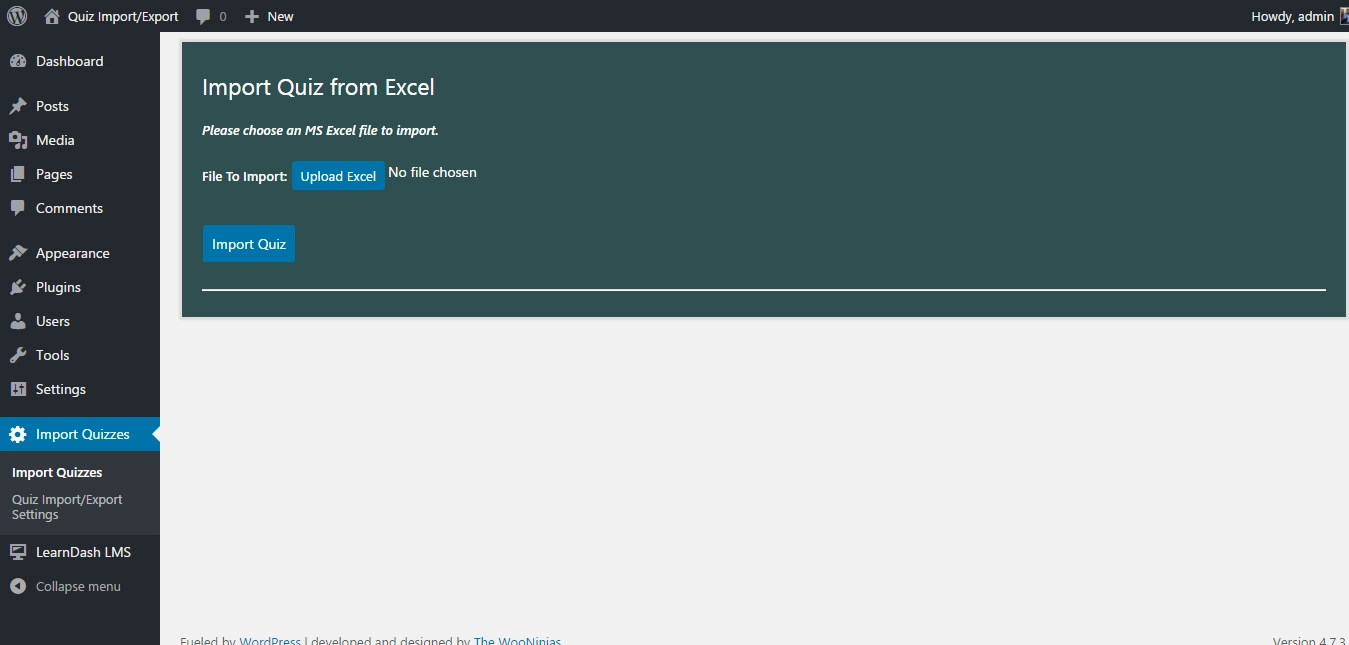 LearnDash 测验导入/导出插件使您的在线课程创建和管理测验变得轻而易举!您可以立即将测验问题导出到 .xls 或 .xlsx 文件中,并从简单的电子表格模板中导入它们。 先决条件: WordPress LearnDash(版本 2.6.1 或更高版本) 特征: 从 Excel 文件导入测验 将测验导出到 Excel 文件 管理员可以设置默认测验值 支持所有 learndash 问题类型 导入时选择现有问题的选项 乳胶文本可以导入/导出到测验中 动作/挂钩: ldqie_before_quiz_import(在导入测验之前调用) ldqie_after_quiz_import(导入测验后调用) 安装 安装之前,请确保您安装了最新的 LearnDash。 将插件文件上传到 `/wp-content/plugins/` 目录,或直接通过 WordPress 插件屏幕安装插件。 通过 WordPress 中的插件屏幕激活插件