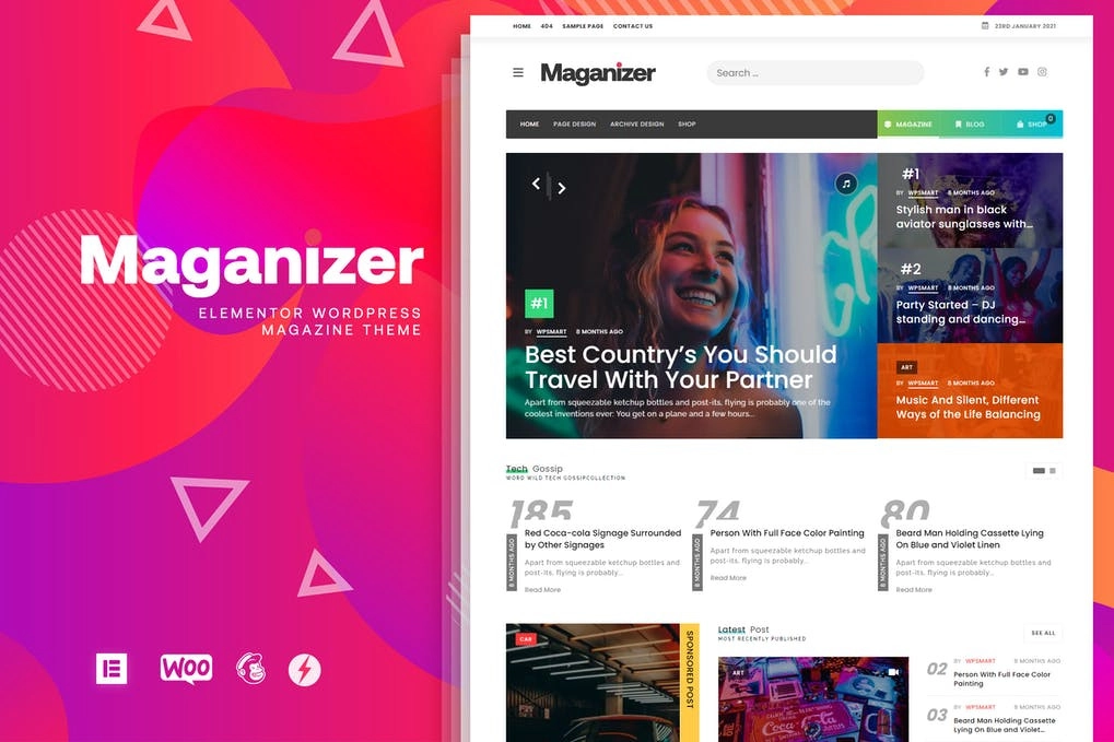 Maganizer 主题设计作为现代 UI 基础主题,并且有非常新且独特的 3 个主页设计,简单博客、现代杂志和 Woocommerce 。加载速度也非常优化,不用担心加载问题。使用 Elementor 插件构建完整主题(不需要 Elementor Pro 插件,无论如何 Elementor Pro 也 100% 支持)。 Wocoomerce 支持,特别是您可以使用 Maganizer 构建自己的设计,这意味着页眉、页脚、单页、存档页面以及无需 Elementor Pro 即可构建的任何其他页面。 古腾堡就绪 Elementor 页面构建器就绪 + 60 个自定义 Elementor 块 设计任何页面或任何元素 设计您自己的自定义标头 设计你的页脚 根据需要设计任何页面(单页面、存档页面、标签页面或任何其他页面) 10000 多个选项可供定制 内置社交媒体计数器(无需任何自定义插件) 100% 邮件黑猩猩兼容 额外的自定义选项面板 Woocommerce 也准备好了,轻松启动您的在线商店 代码优化良好,加载速度快 内置高级社交分享选项 您是 WordPress 新手吗?别担心,我们有支持论坛和 YouTube 教程视频集 RTL 语言支持