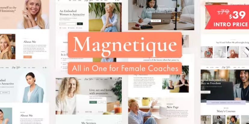 Magnetique:女性教练 WordPress 主题专为女性导师、生活、商业、健康和时尚教练设计。针对 SEO 进行了优化,100% 响应式视网膜显示屏,出色的设计,包括支持。