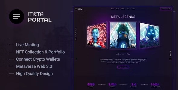 MetaPortal 是一个 NFT 投资组合和登陆页面 WordPress 主题,可用于构建您自己的 NFT 投资组合页面。 MetaPortal 是一个设计最佳的 NFT 区块链、加密货币、加密艺术、数字和更多用途的 WordPress 主题。欢迎我们的 Live NFT 作品集和登陆页面 WordPress 主题。