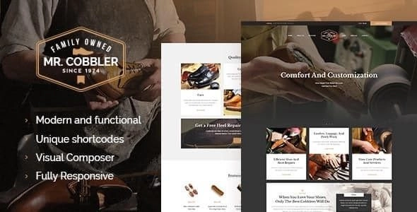 Mr. Cobbler 是一个时尚优雅的定制制鞋维修 WordPress 主题。它是专为鞋匠、定制和鞋/服装制造商、在线鞋店、商店/服装修理店或任何其他主题相关的电子商务网站而设计的。此外,它非常适合鞋匠、修鞋店、制鞋机构、靴匠修补公司。此外,它还适合裁缝、服装生产修补。 Cobbler 制鞋 WordPress 主题功能 在线预约预订管理 漂亮的页面:服务、作品集、预约、团队 联系表格 完整的 Woocommerce 商店兼容性 出色的画廊帖子布局 制鞋维修 WordPress 主题插件 Mr. Cobbler 加载了如此多的预建页面,因此您可以创建在线演示文稿时感到轻松,只需使用一键演示安装选项导入它们即可!这里的一个主要功能是 WPBakery 页面生成器兼容性,这使得创建您自己的页面布局变得非常容易。我们使主题与 Essential Grid、Booked Appointments、MailChimp、Slider Revolution、WooCommerce 等插件兼容,并为其提供了大量自定义短代码和小部件。
