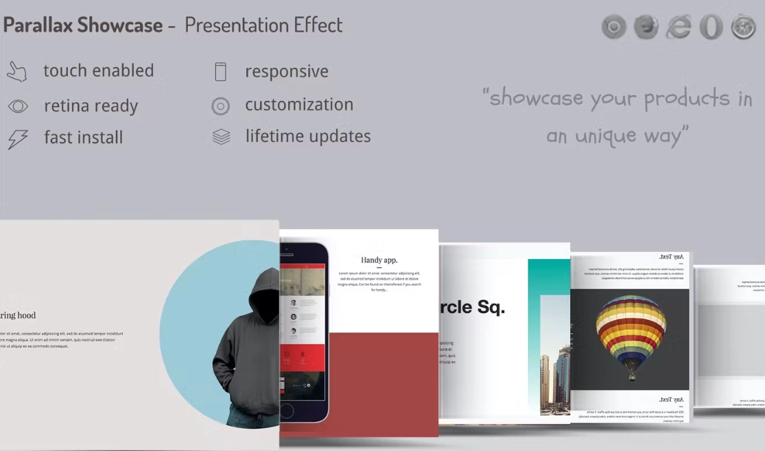 使用 Parallax Showcase 以独特的方式展示您的组件。通过此插件中捆绑的多种滚动效果,为您的产品提供特殊的演示。 有七个预制模板,您可以在其中使用如何展示您的产品。