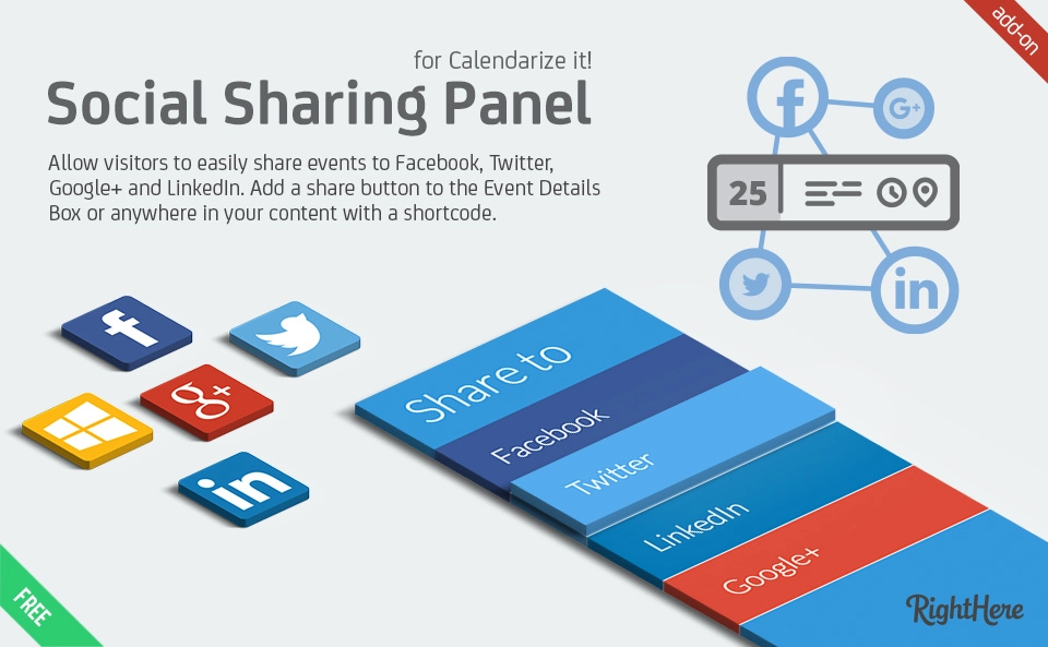用于日历化的社交共享面板插件!让您的访客可以轻松地将活动分享到 Facebook、Twitter、Google+ 和 LinkedIn。