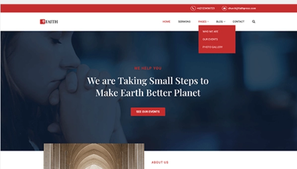 FaithPress 是帮助您为教堂或宗教组织建立网站的完美主题。它具有丰富的功能和布局特性,可帮助您分享教堂的活动日期、布道、资源等。 您可以使用拖放功能构建自己的教会网站布局,添加博客、照片库和各种页面,以帮助人们与您的教会建立联系并了解如何参与。