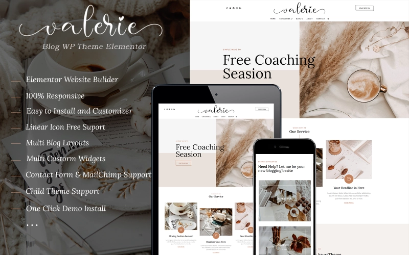 Valerie 是一个优雅而女性化的 WordPress 主题,具有独特的设计元素来讲述您的故事。它专为 WordPress 上易于使用的 Elementor Free 而设计。只需拖放即可到达您的梦想网站,如果您愿意,甚至可以保留当前的主题!