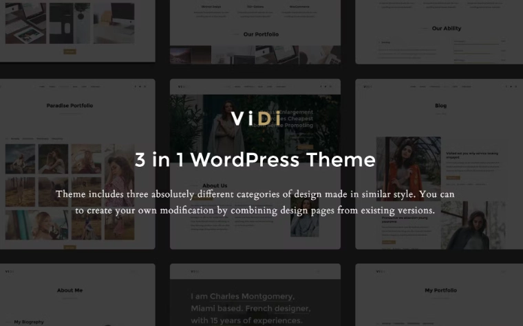 我们创建了一个主题,其中包括三个完全不同类别、风格相似的设计。您只需点击几次即可轻松更改网站类型。此外,还可以通过组合现有版本的设计页面来创建您自己的修改。我们尽力使我们的主题灵活且用户友好。作者基于众所周知的 Visual Composer 和 Redux 选项,这就是为什么该主题有大约一百个设置。我们非常感谢您选择 ViDi。