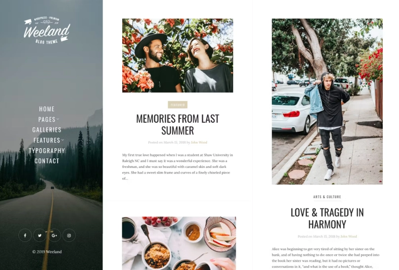 Weeland 是一款时尚、优雅、简约的 WordPress 主题,专为个人博客而设计。这个主题是生活方式、烹饪、旅行、时尚、艺术、摄影和任何其他类型的精彩博客的完美选择。 Weeland 主题有几个可用的 WordPress 主题定制器的定制选项。主题也是多语言的并准备好翻译。文档齐全,即使对于 WordPress 初学者来说也非常容易使用。主题翻译成 5 种语言:英语、德语、荷兰语、西班牙语、法语。