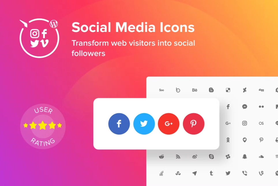 社交媒体图标插件是一款时尚、简单且可自定义的工具,可让您在网站上显示社交网络个人资料链接。这是与网站访问者分享社交帐户并获得新订阅者的最简单方法之一。无需任何额外努力即可推广您的社交媒体是一个梦想,现在它已经实现了!为了让您更加方便,我们确保安装和配置它非常简单。