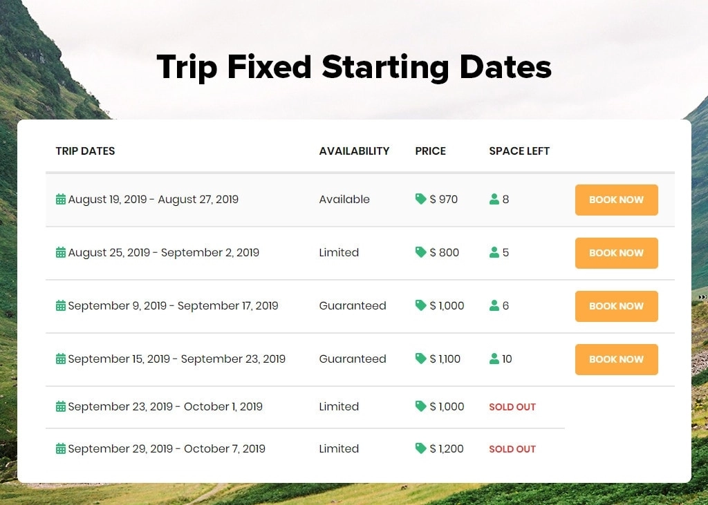 默认情况下,全年所有行程均可预订。您是否有固定出发日期的行程,并且希望仅在这些日子预订? 行程固定开始日期扩展允许您设置可以预订行程的具体日期。此外,它还允许您设置可用点的数量和重复时间。