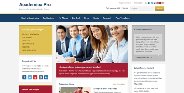 Academya Pro 3.0 是一个多用途、响应式主题,具有小部件 3 列主页布局和事件日历集成,非常适合教育、企业和社交/非营利网站。 Academica Pro 3.0 概述 Academya Pro 提供高度灵活的主题布局。您可以从 3 列布局更改为 2 列布局,左侧或右侧各有一个侧边栏。您还可以单独调整每个页面的布局:逐页切换到 3、2 或 1 列布局以适应内容。 标题包括 3 个可以使用或禁用的菜单:如果您愿意,您可以仅使用 2 或 1 个菜单。 有自定义徽标吗?直接从主题定制器上传它,它将出现在主题的标题中。